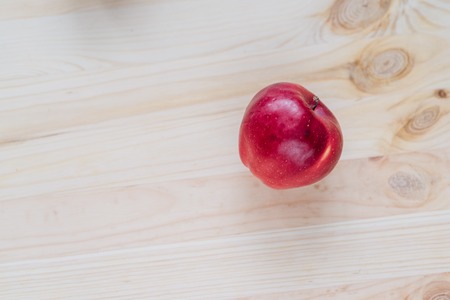 Red apple on wooden tabletop