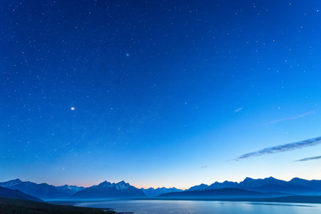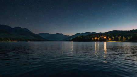 beautiful view of the lake at night against the backdrop of mountains and clear skies