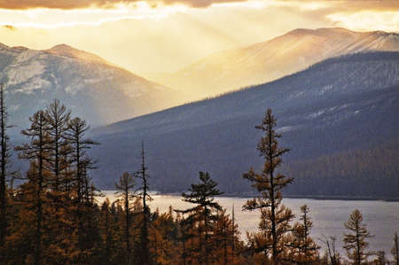Mountain landscape with lake and forest at sunset. Siberia, Russia