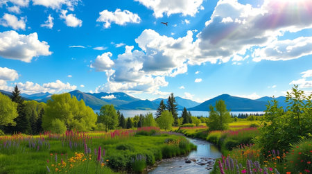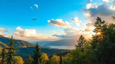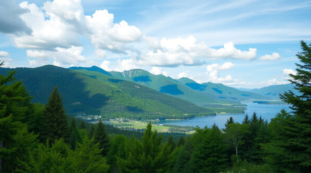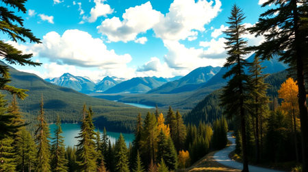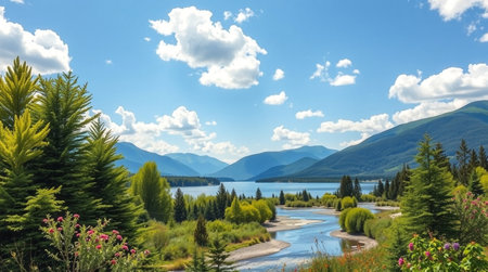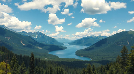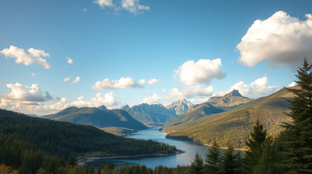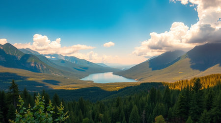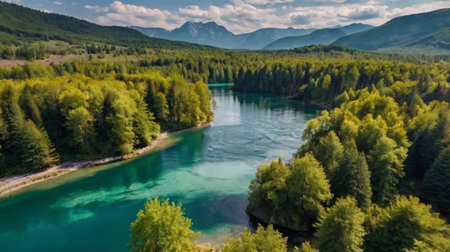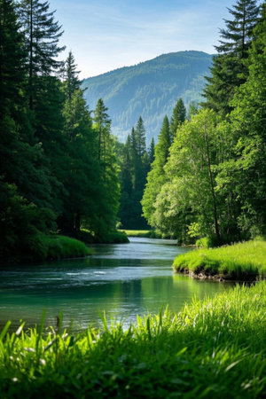 A sunlit mountain valley a clear river winding through a dense, green pine forest under a bright blue sky.