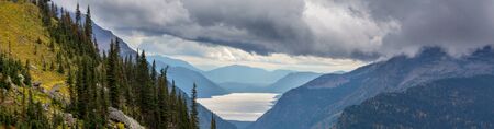 Mountain lake in the Canadian Rockies at sunset. Panoramic view.