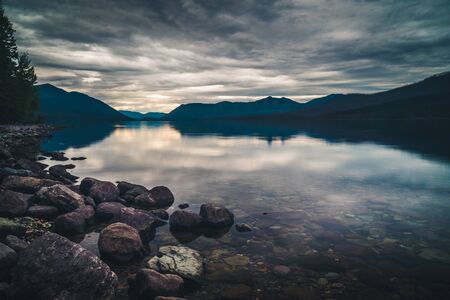 Blue lake idill under cloudline sky. The stones on the shore of the lake and background