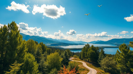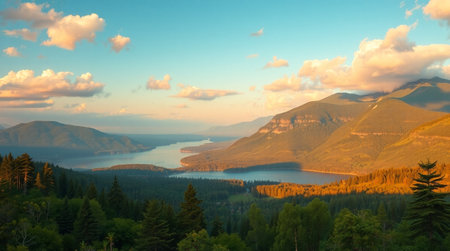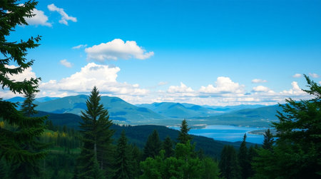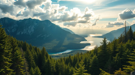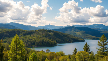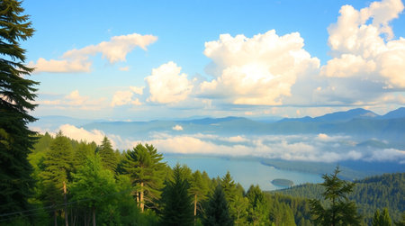 Picturesque landscape with a mountain lake, pine trees in the foreground, fog above the lake and among the mountains and a large sky with cirrus clouds