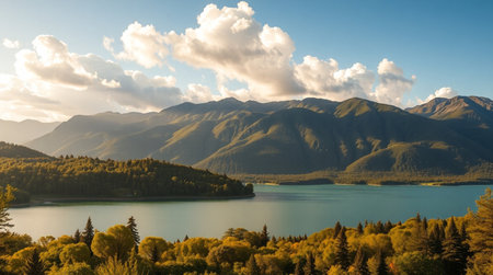 Mountain lake and forest at sunset. Beautiful autumn landscape in the mountains.