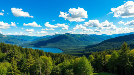 Panoramic view of the lake and mountains. Beautiful summer landscape.