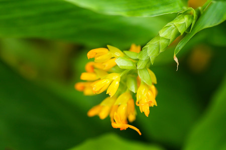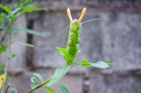 Beautiful gold finger plant Juanulloa mexicana blooming outdoors in Japan. High quality photo