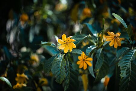Close up morning light ray on beautiful yellow flower with leaves green background