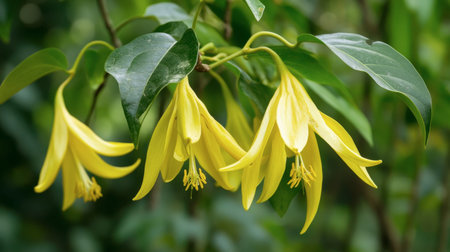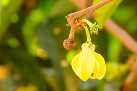 A closeup shot of a beautiful single yellow tropical flower Ylang Ylang