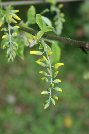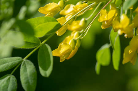 Unfocused, natural background with bokeh and blossoming yellow locust in the forest. selective focus