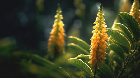 Beautiful yellow flowers emerge from green leaves, showcasing nature's vibrant palette. This floral arrangement captures the essence of outdoor tranquility and growth.