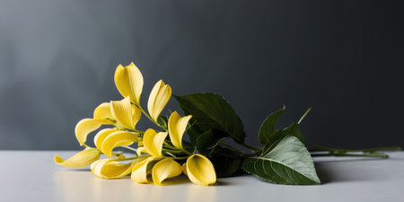 Two yellow colored plucked flowers with leaves on surface with white background. These flowers are called as Michelia champaca also known as sonchampa which are very fragrant flowers used in perfumes.