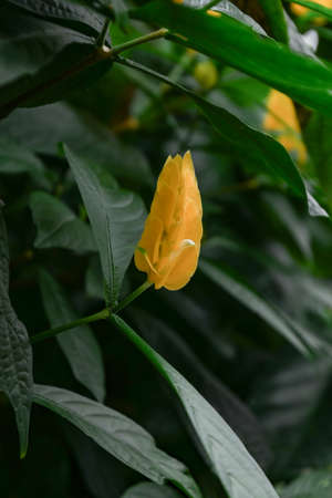Closeup macro of beautiful yellow pachystachys lutea golden shrimp flower with dark green leaves in garden greenhouse indoors. Natural textured background with copyspace. Toned with retro filters