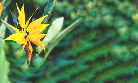 Architectural design in floral style. Interior decor mit yellow tropical flower in full bloom. Blurred effect. Close-up