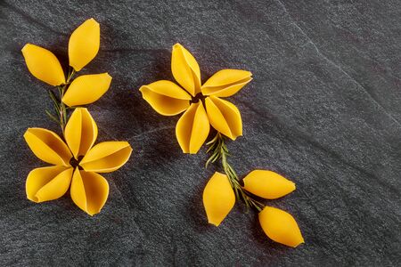 Dry shells pasta like a flower on black stone background.