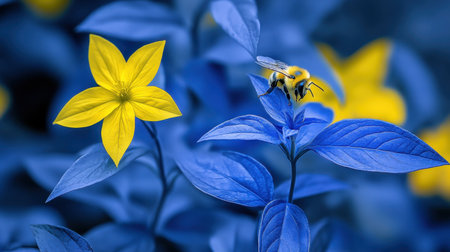 A stunning image capturing a yellow flower and a busy bee against a backdrop of blue leaves, illustrating the beauty of nature's diversity and the importance of pollination in ecosystems.