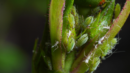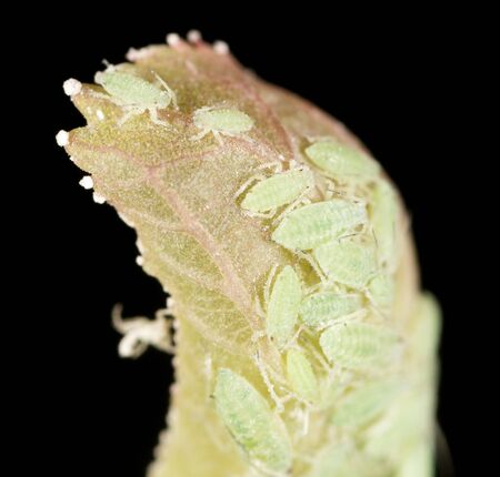 Macro photography. Different sizes aphids swarm gathering on a fresh spring rose leaf. Soft selective focus.