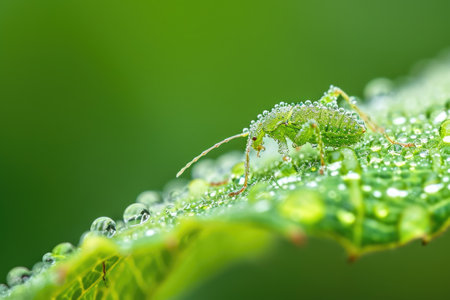 A green insect stands on a leaf glistening with morning dew. Soft sunlight illuminates the surroundings, creating a serene atmosphere in a lush environment.