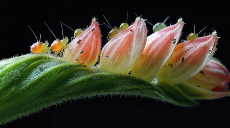 A detailed macro shot of tiny orange insects gathered on a green plant stem, showcasing the intricate patterns and textures of nature. Perfect for educational use.