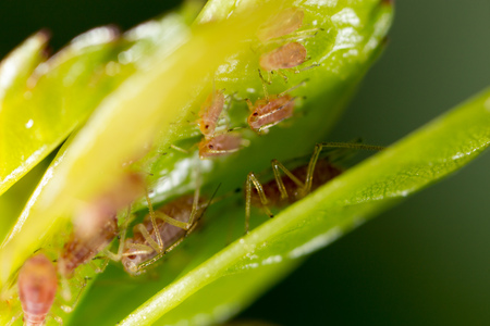 close up of aphids on a green leaf, taken photos in the natural wild state, Luannan County, Hebei Province in China.