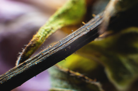 A detailed close-up image showcasing yellow aphids actively feeding on a vibrant green plant stem, highlighting intricate textures and natural beauty in nature.