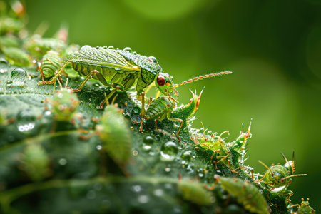 This macro photograph captures a cluster of green aphids resting on a leaf, adorned with dew drops. The soft focus emphasizes the delicate nature of these small insects, showcasing their role in the ecosystem.
