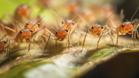 A group of tiny aphids gathered on a leaf, creating a fascinating display of insect life as they feed and interact in their micro-world.