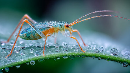 An exquisite close-up image of a colorful insect perched on a dewy green leaf, showcasing fine details and vibrant colors that highlight the beauty of nature.