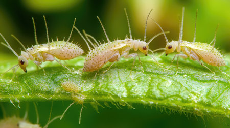 Close-up view of tiny insects residing on a green leaf, showcasing details of their structure and the lush environment around them. Ideal for nature studies.