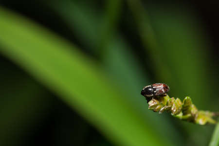 Macro Photography to black beetle crawling in green grass at sunny