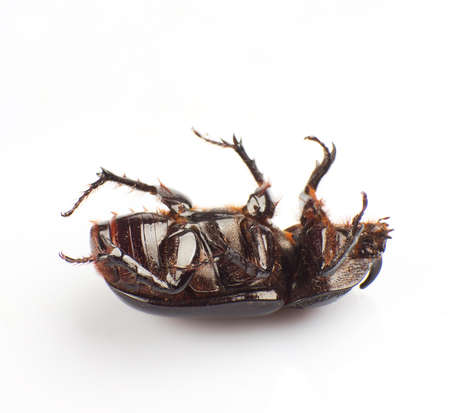 Five dead beetles lying upside down on a white background