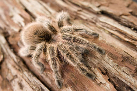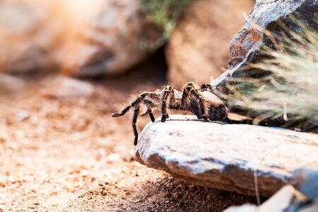 Fluffy brown spider in the terrarium close up, brachypelma albopilosum