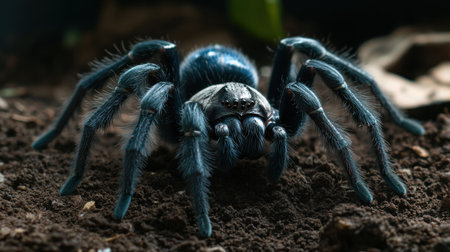 This captivating close-up image showcases a blue tarantula resting on rich brown soil, highlighting its intricate details and vibrant colors amidst a natural background.