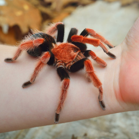 Birdeater tarantula spider Brachypelma boehmei held in hand in natural forest environment. Bright red colorful giant arachnid. Wildlife, biology, zoology, arachnology, science, education, zoo