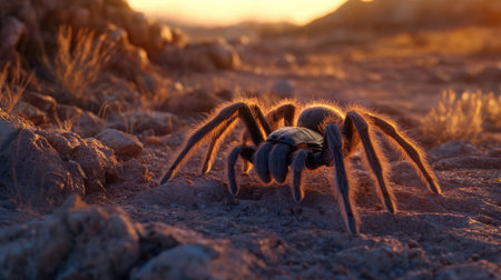 This image captures a detailed close-up of a tarantula spider crawling over rocky terrain during a stunning sunset, showcasing nature's raw beauty.