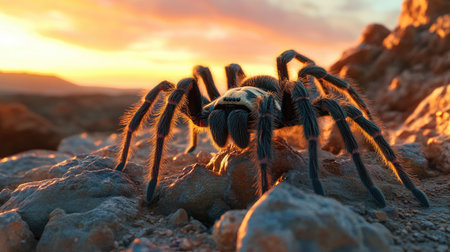 A stunning close-up of a spider, specifically a tarantula, perched on rocky terrain against a breathtaking sunset backdrop.