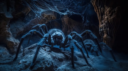 Large, eerie spiders in webs inside a dark cave, night setting capturing a chilling atmosphere