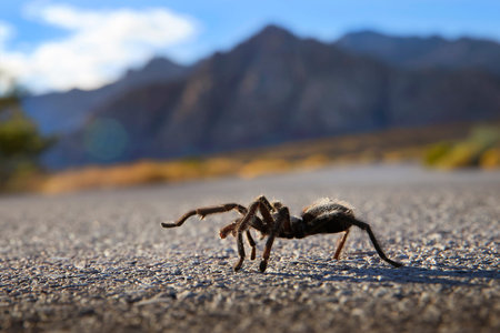 Tarantula Crossing Sunlit Road with Mountains in Background Desert Wildlife Nevada