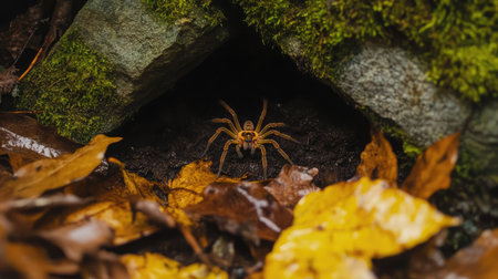 Detailed macro image of a tarantula in its natural habitat, highlighting intricate spider details