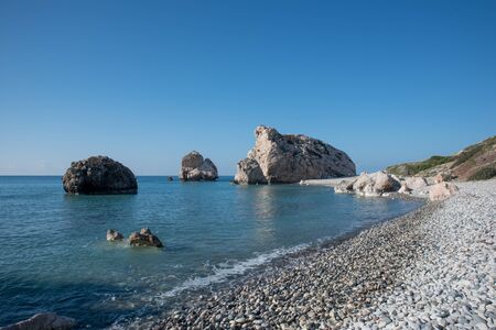 Rock of Aphrodite the birthplace of Aphrodite the Greek goddess of love, on a shoreline beach of Western Cyprus between Paphos and Limassol, facing the Mediterranean Sea with a clear blue sky