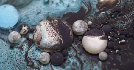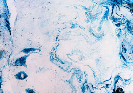 Abstract art background. Blue and white wet paint mixture. Stained bubbled textured surface.