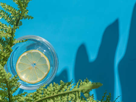 Green leaves and a glass with lemon , on a blue background . The concept of freshness and relaxation