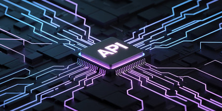 A central chip labeled API on a dark circuit board with glowing blue and purple lines.