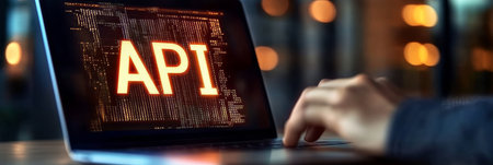 Laptop with illuminated keyboard shows coding interface and API development concept in digital format