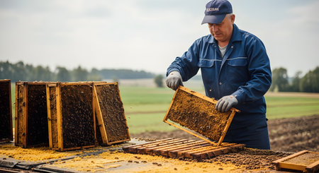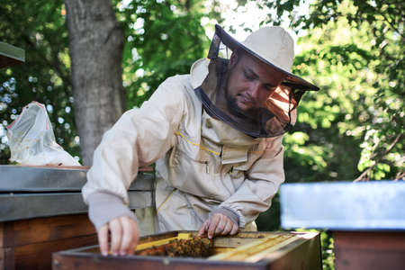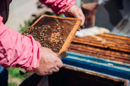 Beekeeper is working on a honeycomb in his apiary.