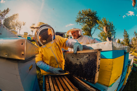 Beekeepers checking honey on the beehive frame in the field. Small business owners on apiary. Natural healthy food produceris working with bees and beehives on the apiary.