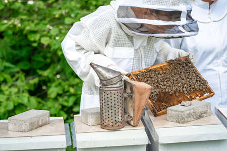 Beekeeper with smokepot and honey frame at apiary
