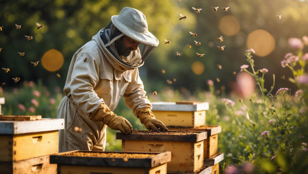 Beekeeper tending to hives during golden hour in a blooming garden setting