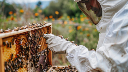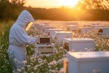 A beekeeper tends to beehives amidst a field of flowers. Care and attention in apiary work.