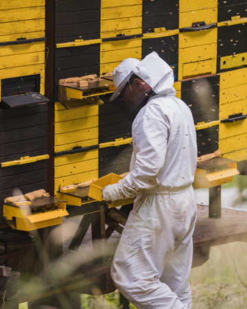 A professional beekeeper working on collecting honey from beehives.