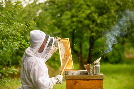 Beekeeper in uniform with honey frame at apiary